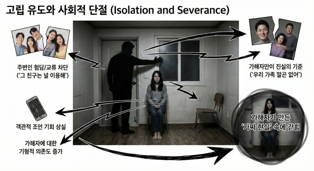 피해자가 사회적으로 고립될수록 객관적인 조언을 들을 기회는 사라지고, 가해자에 대한 의존도는 기형적으로 높아집니다. 결국 피해자의 세계에는 가해자만이 유일한 진실의 기준이 되며, 가해자가 만든 ‘가짜 현실’ 속에 갇히게 됩니다.