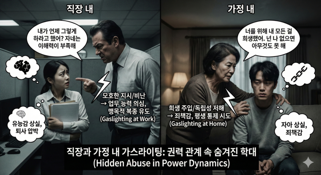 가정 내 가스라이팅은 부모 자식 간이나 부부 사이에서 발생합니다. 부모가 자녀에게 “너를 위해 내 모든 걸 희생했어”, “너는 나 없으면 아무것도 못 해”라고 주입하는 것이 대표적입니다. 이는 자녀의 독립성을 저해하고 죄책감을 심어주어 평생 부모의 통제 하에 두려는 시도입니다.