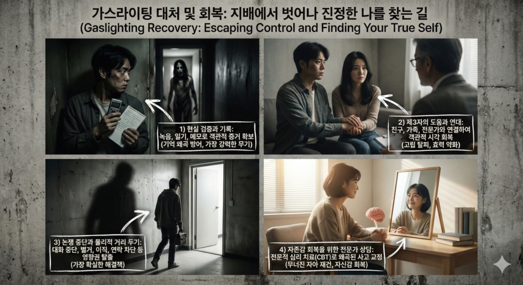 가스라이팅은 심리적 지배 상태이므로, 피해자 스스로의 힘만으로는 빠져나오기 어려울 수 있습니다. 그러나 회복은 분명히 가능합니다. 다음은 전문가들이 제안하는 구체적인 대처법입니다.