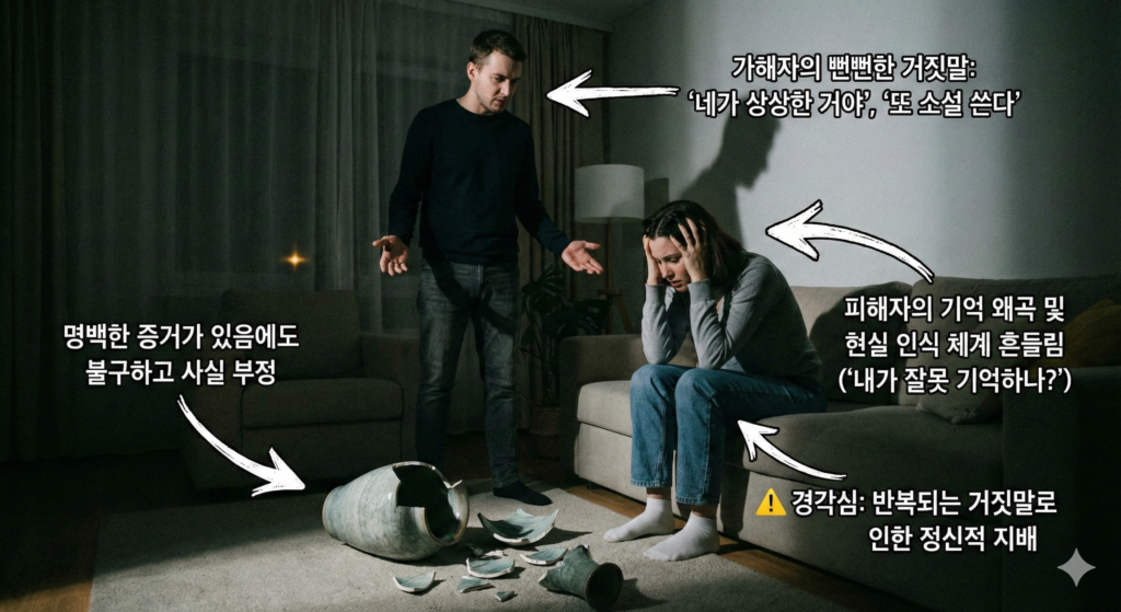 이러한 거짓말이 반복되면 피해자는 처음에는 반발하지만, 점차 ‘내가 정말 잘못 기억하고 있나?’라는 의구심을 갖게 됩니다. 가해자는 이 틈을 놓치지 않고 자신의 거짓된 주장을 사실인 것처럼 주입하여 피해자의 현실 인식 체계를 흔들어 놓습니다.