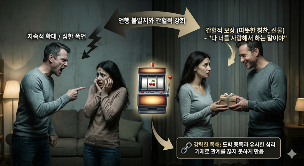가해자는 심한 폭언을 한 뒤 갑자기 다정하게 대하며 “다 너를 사랑해서 하는 말이야”, “나니까 너를 감당하는 거야”라고 말합니다. 피해자는 이 순간적인 안도감과 사랑받는 느낌에 중독되어, ‘이 사람은 사실 나를 사랑해, 내가 조금만 더 노력하면 변할 거야’라는 헛된 희망을 품게 됩니다. 이는 도박 중독과 유사한 심리 기제로, 피해자가 관계를 끊어내지 못하게 만드는 강력한 족쇄가 됩니다.