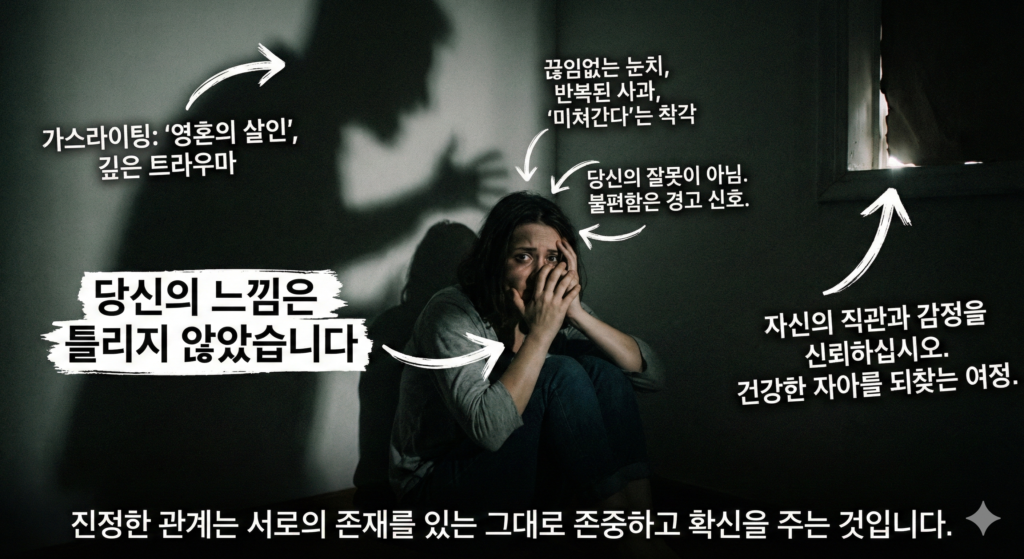 가스라이팅은 ‘영혼의 살인’이라고 불릴 만큼 피해자에게 깊은 트라우마를 남깁니다. 만약 지금 누군가와의 관계에서 끊임없이 눈치를 보고 있고, 사과를 반복하며, 자신이 미쳐가고 있다고 느낀다면, 그것은 당신의 잘못이 아닙니다. 당신은 예민한 것이 아니라, 부당한 대우에 반응하고 있는 것입니다.