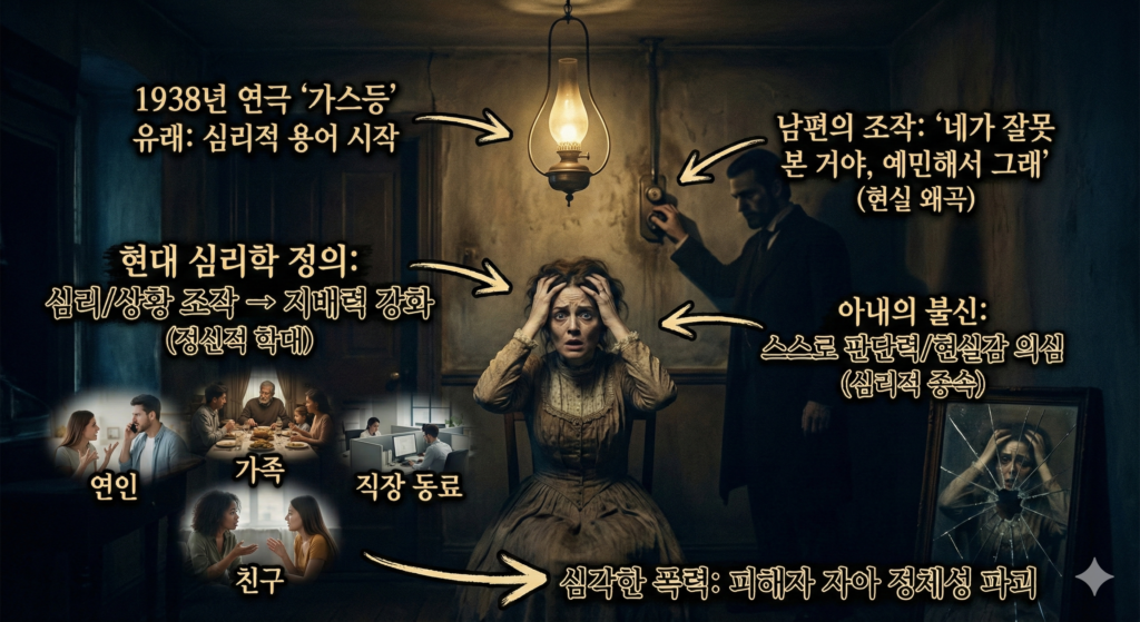 현대 심리학에서 정의하는 가스라이팅은 ‘타인의 심리나 상황을 교묘하게 조작해 그 사람이 스스로 타당성, 판단력, 현실감을 의심하게 만듦으로써 타인에 대한 지배력을 강화하는 정신적 학대 행위’입니다. 이는 연인 관계뿐만 아니라 가족, 직장 동료, 친구 사이에서도 빈번하게 발생하며, 피해자의 자아 정체성을 파괴하는 심각한 폭력입니다.