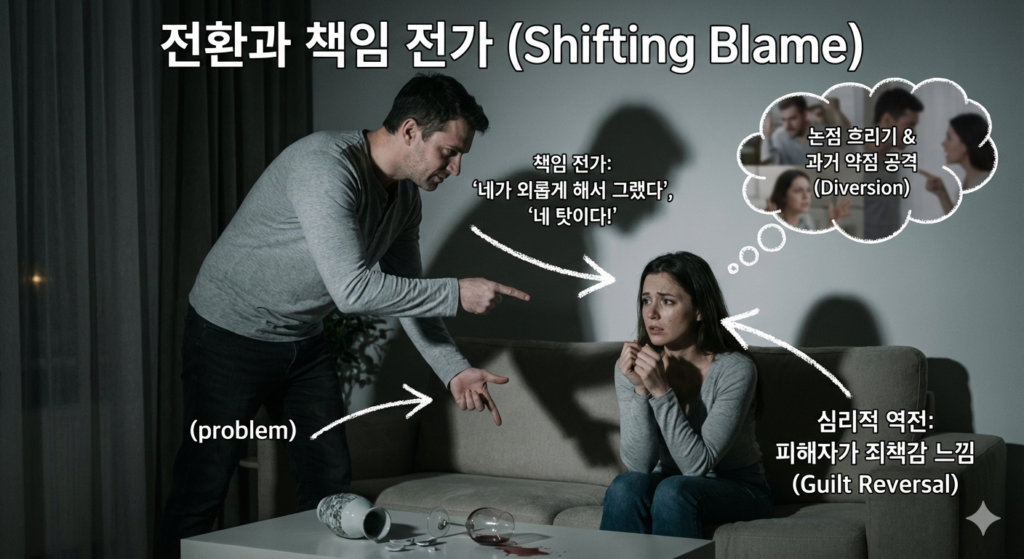 가스라이팅 가해자는 절대로 자신의 잘못을 인정하지 않습니다. 문제가 발생하면 논점을 흐리거나(Diversion), 대화의 주제를 바꾸어 피해자를 공격합니다. 예를 들어, 가해자의 외도 사실이 드러났을 때, 그들은 자신의 부정행위를 사과하는 대신 “네가 나를 외롭게 해서 그랬다”, “네가 의심을 하니까 내가 숨긴 것이다”라며 원인을 피해자에게 돌립니다.