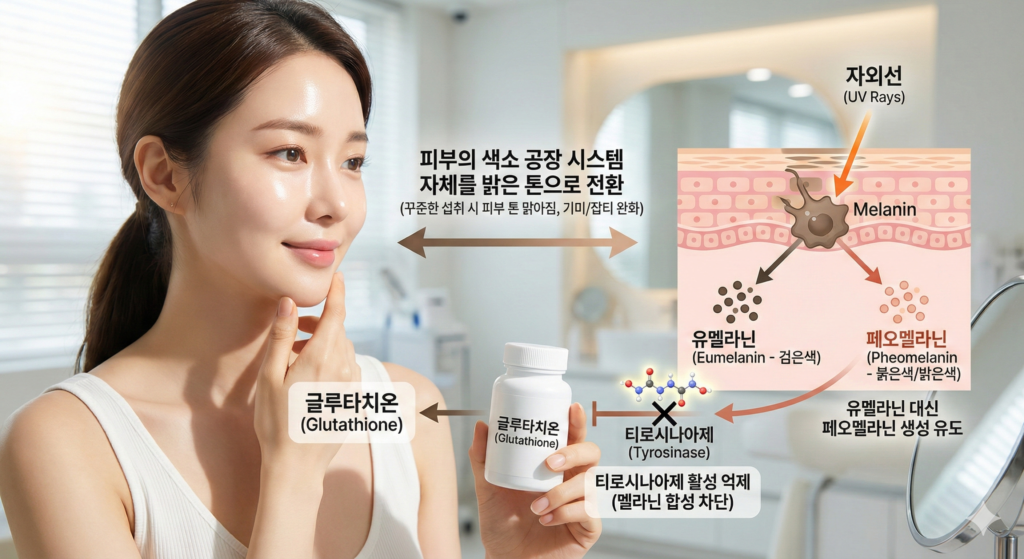 글루타치온은 멜라닌을 합성하는 효소인 티로시나아제(Tyrosinase)의 활성을 억제할 뿐만 아니라, 검은 유멜라닌 대신 밝은 페오멜라닌의 생성을 유도합니다. 즉, 단순히 색소를 없애는 것이 아니라 피부의 색소 공장 시스템 자체를 밝은 톤으로 전환시키는 원리입니다. 꾸준히 섭취했을 때 피부 톤이 맑아지고 기미나 잡티가 옅어지는 이유가 바로 여기에 있습니다.
