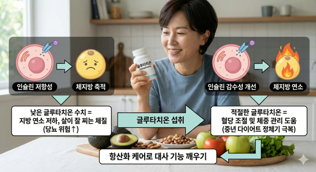 적절한 글루타치온 수치 유지는 인슐린 감수성을 높여 혈당 조절을 돕고, 체지방 대사를 원활하게 하여 중년 이후의 체중 관리에도 긍정적인 영향을 미칩니다. 다이어트 정체기에 빠졌다면 대사 기능을 깨우는 항산화 케어가 필요할 수 있습니다.