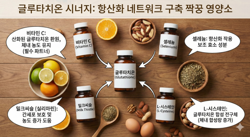 글루타치온 단독 섭취보다 더 강력한 효과를 내기 위해서는 ‘항산화 네트워크’를 구축하는 것이 중요합니다. 다음 영양소들과 함께 섭취하면 글루타치온의 생성과 재활용을 극대화할 수 있습니다.
