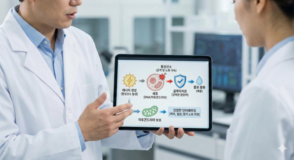 우리가 숨을 쉬고 에너지를 만드는 과정에서 필연적으로 ‘활성산소’라는 찌꺼기가 발생합니다. 이 활성산소는 세포막과 DNA를 공격하여 노화를 가속화하고 각종 질병을 유발합니다. 글루타치온은 강력한 환원력을 바탕으로 이 활성산소를 물로 중화시켜 배출합니다.