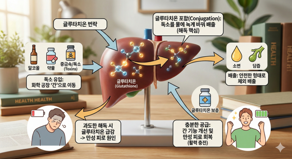 이때 글루타치온은 독성 물질을 물에 잘 녹는 형태로 바꾸어 소변이나 담즙으로 배출시키는 포합(Conjugation) 작용의 핵심 성분입니다. 술을 마신 다음 날이나 만성 피로에 시달릴 때 글루타치온 수치가 급격히 떨어지는 것은 해독을 위해 막대한 양이 소모되었기 때문입니다. 따라서 충분한 글루타치온 공급은 간 기능을 개선하고 만성 피로를 회복하는 데 결정적인 도움을 줍니다.