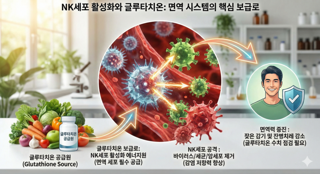 면역 시스템에서 글루타치온의 역할은 군대의 보급로와 같습니다. 우리 몸의 면역 세포인 T세포와 림프구, 그리고 암세포를 공격하는 NK세포(자연살해세포)가 제대로 기능하려면 높은 농도의 글루타치온이 필요합니다.