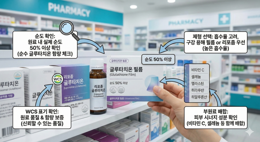 - 순도 확인: 원료 내 글루타치온의 실제 순도가 50% 이상인지 확인하세요. ‘글루타치온 효모 추출물’ 함량이 아닌, 순수 글루타치온 함량을 체크해야 합니다.