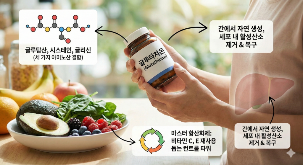 글루타치온은 글루탐산, 시스테인, 글리신이라는 세 가지 아미노산이 결합하여 생성된 단백질입니다. 우리 몸의 간에서 자연적으로 생성되며, 세포 내의 유해한 활성산소를 제거하고 손상된 세포를 복구하는 역할을 합니다. 비타민 C나 E 같은 다른 항산화제들은 사용 후 산화되면 독성을 띠게 되는데, 글루타치온은 이들을 다시 환원시켜 재사용할 수 있게 돕습니다. 즉, 모든 항산화제의 컨트롤 타워 역할을 수행하기 때문에 ‘마스터 항산화제’라는 별명이 붙은 것입니다.