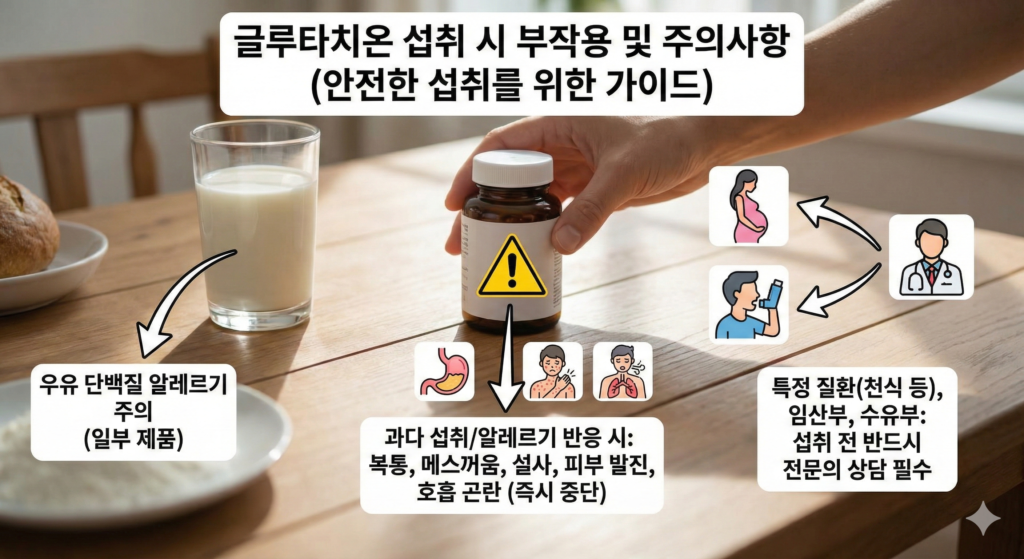 글루타치온은 체내 성분이므로 대체로 안전하지만, 과유불급은 금물입니다. 과다 섭취 시 복통, 메스꺼움, 설사 등의 위장 장애가 발생할 수 있습니다. 또한 우유 단백질 알레르기가 있는 경우 일부 제품 섭취 시 주의가 필요합니다.