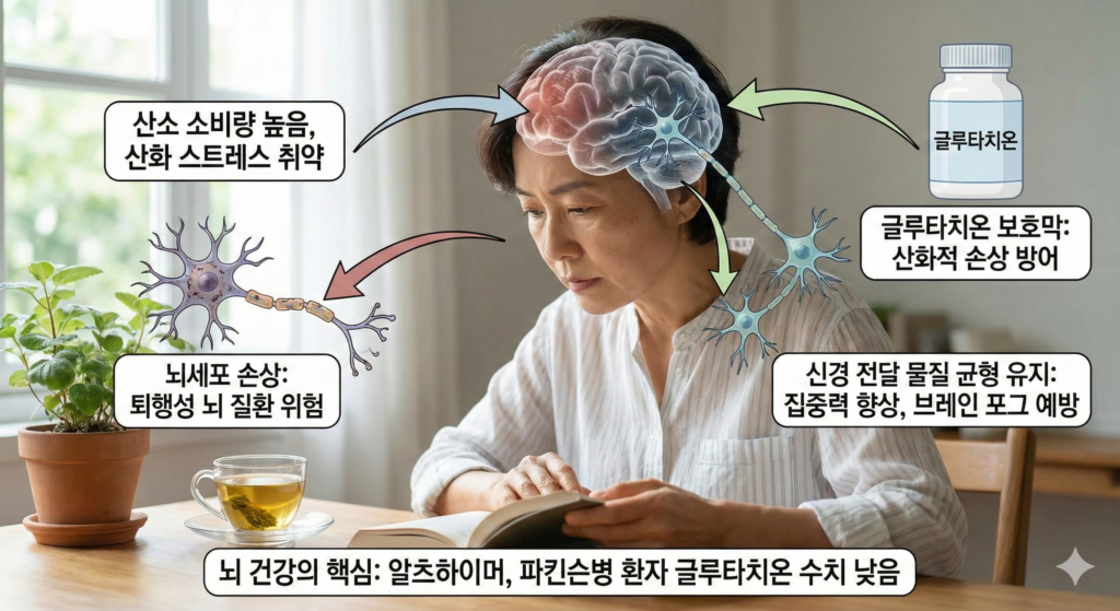 글루타치온은 뇌세포를 산화적 손상으로부터 보호하고 신경 전달 물질의 균형을 유지하는 데 기여합니다. 실제로 알츠하이머나 파킨슨병 환자들의 뇌에서 글루타치온 수치가 현저히 낮게 측정된다는 연구 결과는 뇌 건강에 있어 이 성분의 중요성을 시사합니다. 집중력이 떨어지거나 머리가 멍한 ‘브레인 포그’ 현상을 겪는 현대인들에게도 필수적입니다.