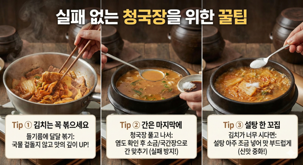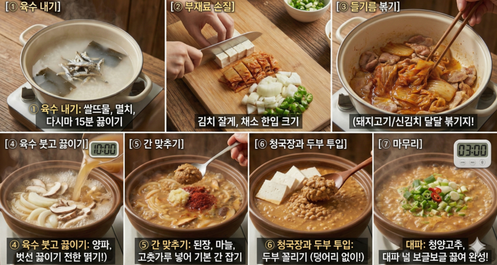 | 청국장 투입 | 처음부터 넣고 오래 끓임 | 마지막 단계에서 넣어 살짝 끓임 |