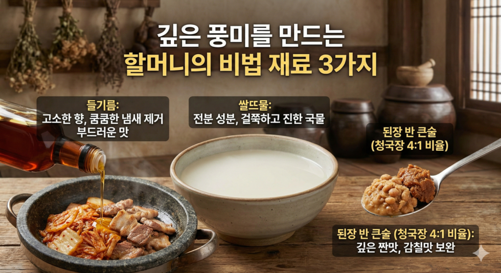 단순히 청국장만 넣는다고 옛날 맛이 나지는 않습니다. 할머니들의 투박한 손맛 뒤에는 과학적인 조화가 숨어있습니다.