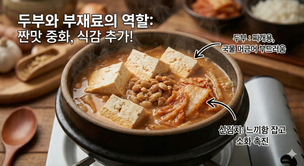 청국장의 짠맛을 중화하고 식감을 더해주는 것이 바로 **’두부’**와 **’신김치’**입니다.