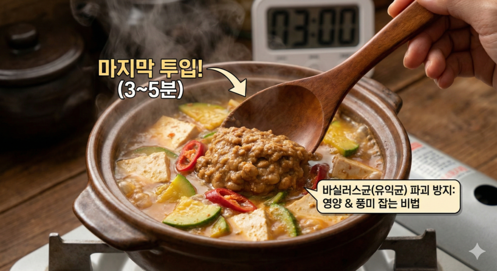청국장에 풍부한 유익균인 바실러스균은 고온에서 오래 끓이면 파괴됩니다. 따라서 모든 재료를 다 익힌 후, 마지막에 청국장을 풀어 3~5분 내외로 가볍게 끓여내는 것이 영양과 풍미를 모두 잡는 비법입니다.