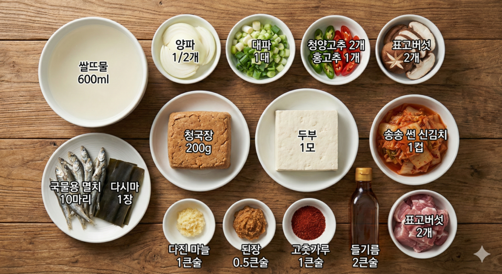 메인 재료: 청국장 200g, 두부 1모, 신김치 1컵(송송 썬 것), 돼지고기(찌개용) 150g