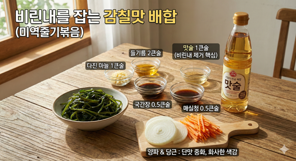 • 황금 배합 (미역줄기 300g 기준): 다진 마늘 1큰술, 들기름(또는 참기름) 2큰술, 국간장 0.5큰술, 맛술 1큰술(비린내 제거 핵심), 매실청 0.5큰술.