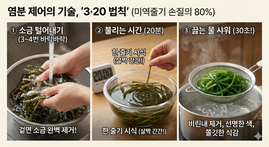 • 불리는 시간 (20분): 깨끗이 씻은 미역줄기를 찬물에 담가 20분간 불려줍니다. 10분은 너무 짜고, 30분은 너무 싱거워져 맛이 없습니다. 20분이 지났을 때 한 줄기 씹어보아 ‘살짝 간간하다’ 싶을 때 건지는 것이 포인트입니다.
