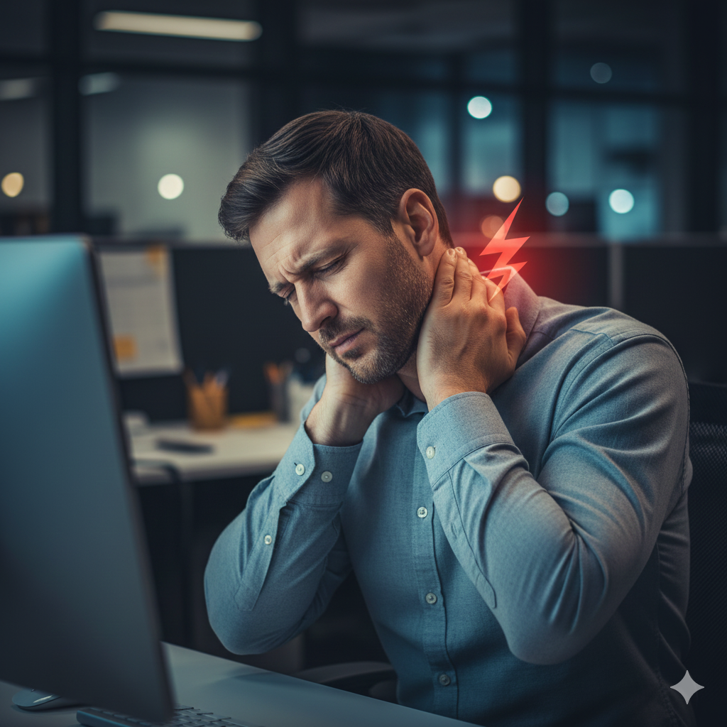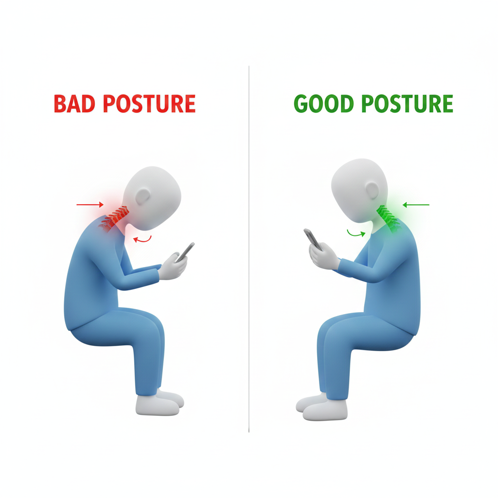 • 잘못된 자세(거북목): 장시간 스마트폰이나 모니터를 보며 목이 앞으로 나오면 뒷목 근육이 신경을 눌러 머리 위쪽까지 통증이 전달됩니다.
