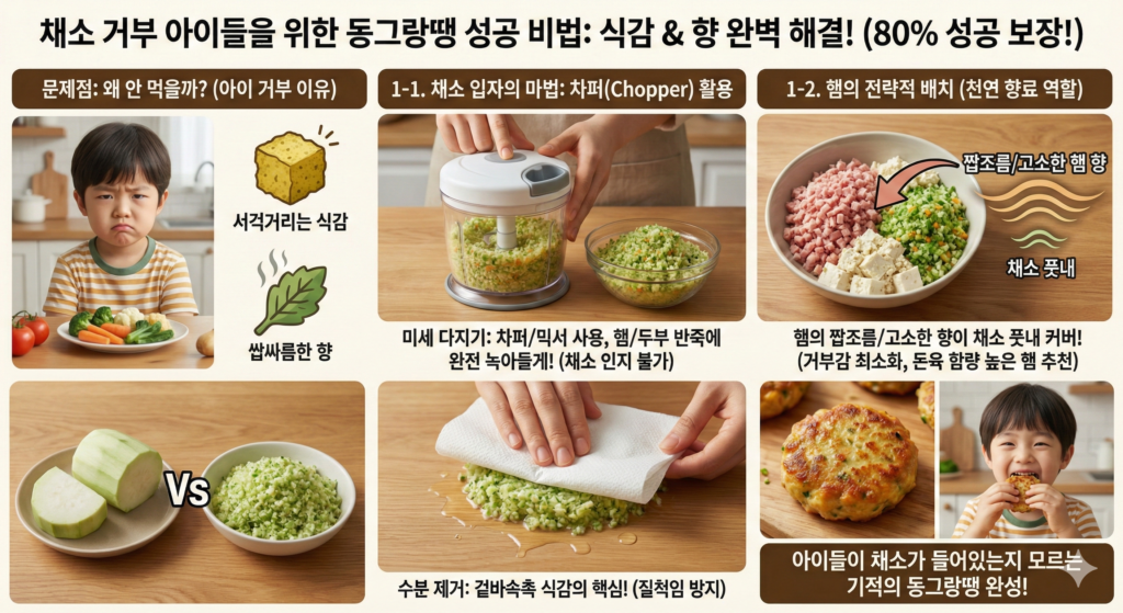 아이들이 채소를 거부하는 이유는 크게 두 가지입니다. 특유의 ‘서걱거리는 식감’과 ‘쌉싸름한 향’ 때문입니다. 이를 해결하는 것이 동그랑땡 성공의 80%를 차지합니다.