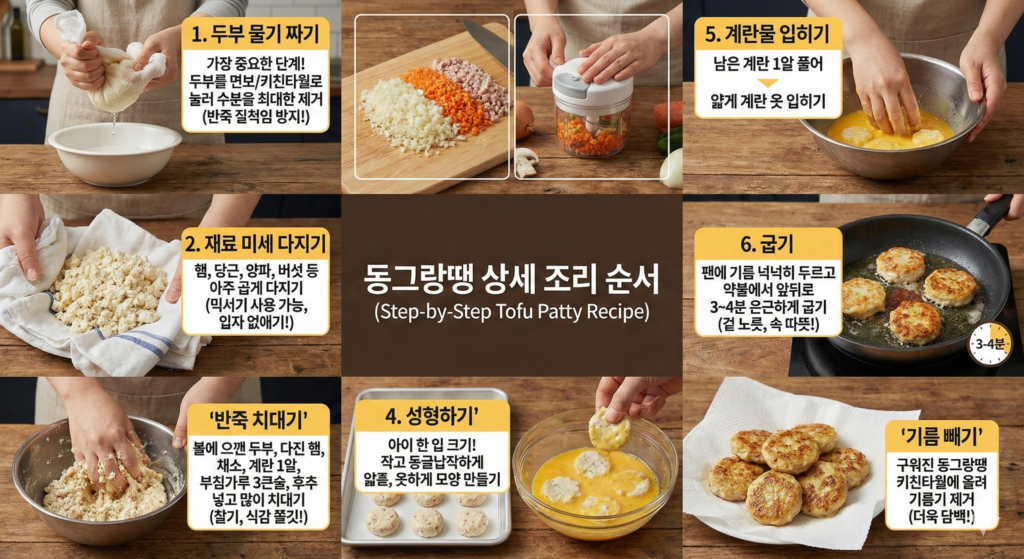 두부의 식물성 단백질과 햄의 동물성 단백질이 계란이라는 응고제와 만나 열을 받으면 단단하게 결합합니다. 이때 부침가루나 전분가루 2~3큰술을 추가하면 반죽 속의 수분을 잡아주어 모양이 흐트러지지 않고 예쁘게 성형됩니다.
