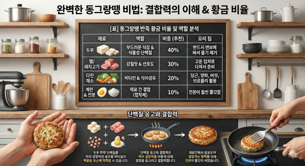 동그랑땡이 팬에서 부서지거나 너무 딱딱해지는 것을 방지하기 위해서는 재료 간의 **’결합력’**을 이해해야 합니다.