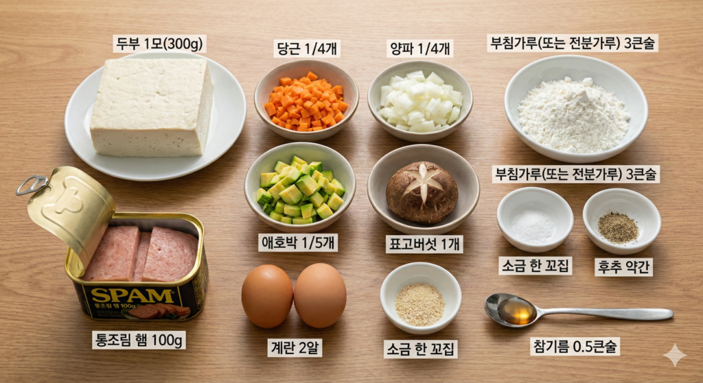메인 재료: 두부 1모(300g), 통조림 햄 100g (또는 소시지), 계란 2알